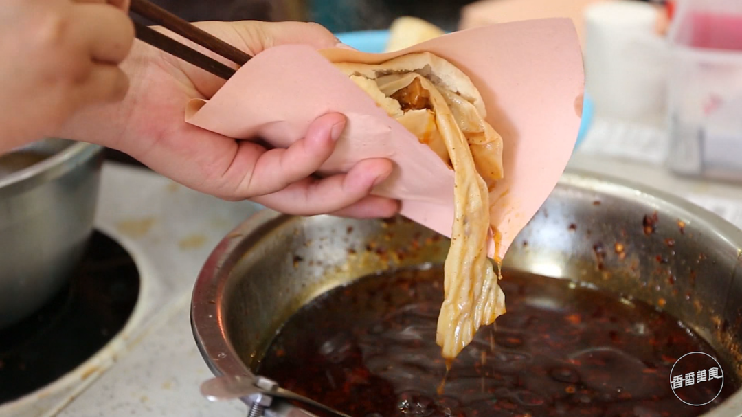 辣椒汁绝对称得上是灌汤烧饼的灵魂,高汤配上辣椒和多种香料一起熬制。豆腐串和豆腐皮在里面一泡,就格外有味。
