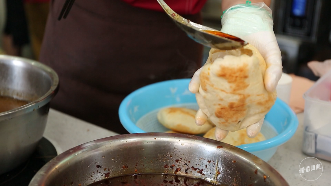 我们点的是4元钱一个的老白经典烧饼。刚出炉的烧饼正烫手,沿着边缘剖开一个口子,塞入豆腐串和豆腐皮。不过这些都是普通饼夹菜的操作,要知道灌汤烧饼的精髓就在于一勺灌汤。