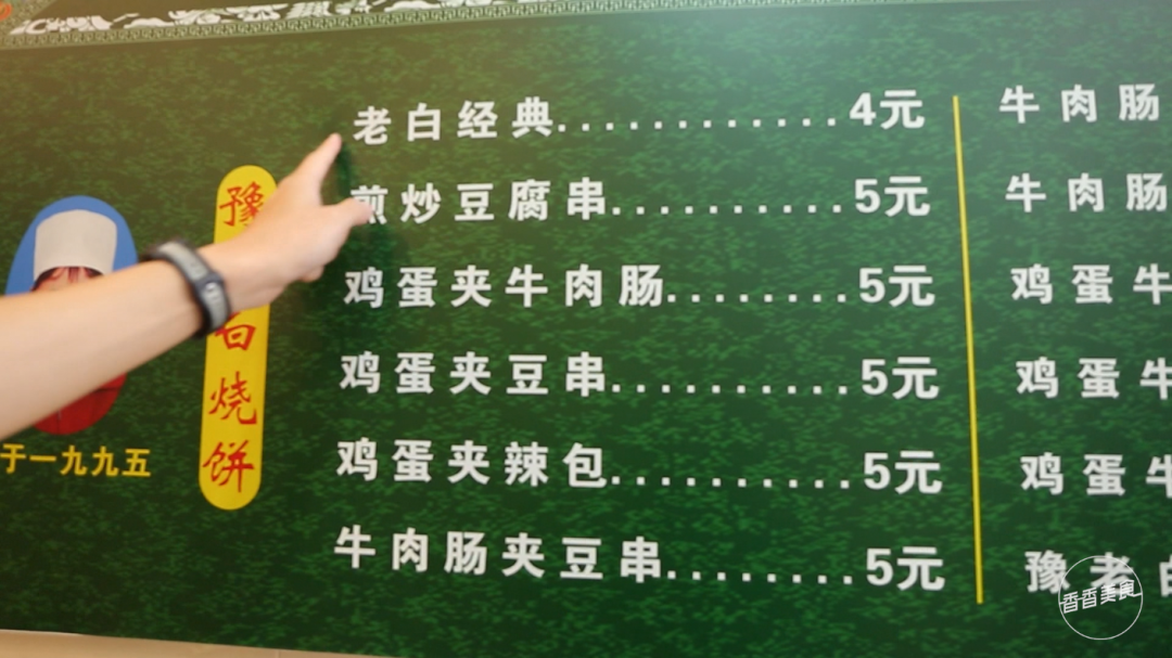 墙上贴着价目表,老白经典烧饼4元、煎炒豆腐串5元、鸡蛋夹牛肉肠5元……在郑州这个价位真不算贵。但是我们还是瞧出了门道,这里的烧饼均价都比原阳涨了一块钱。