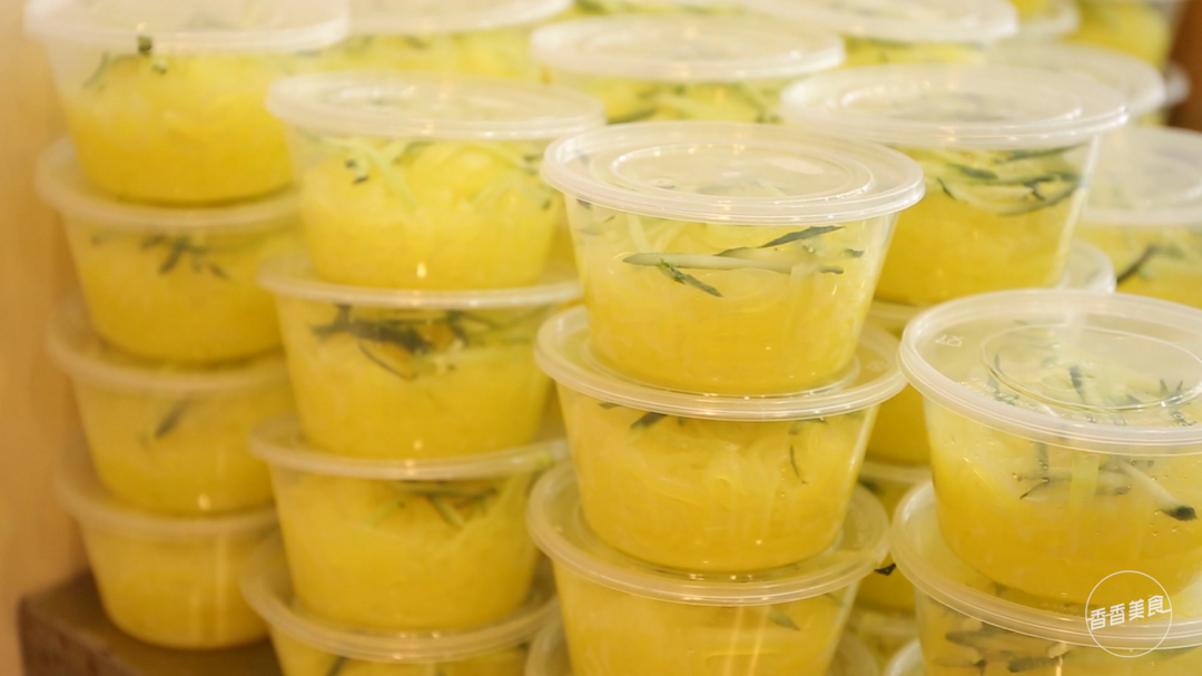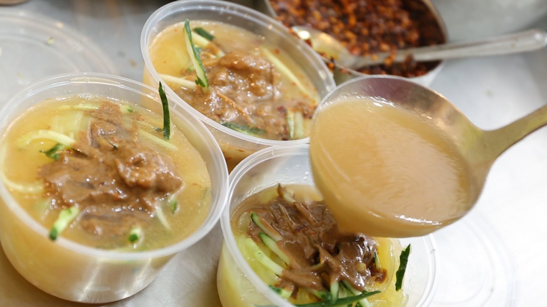 烧饼一入口,辣的直吸溜怎么办?店里还有一样美食,搭配起来解辣又过瘾。绿豆凉粉,看起来颜色微微发黄。料汁往上一浇,才能激发出它的滋味。