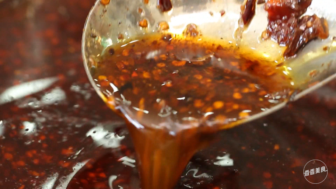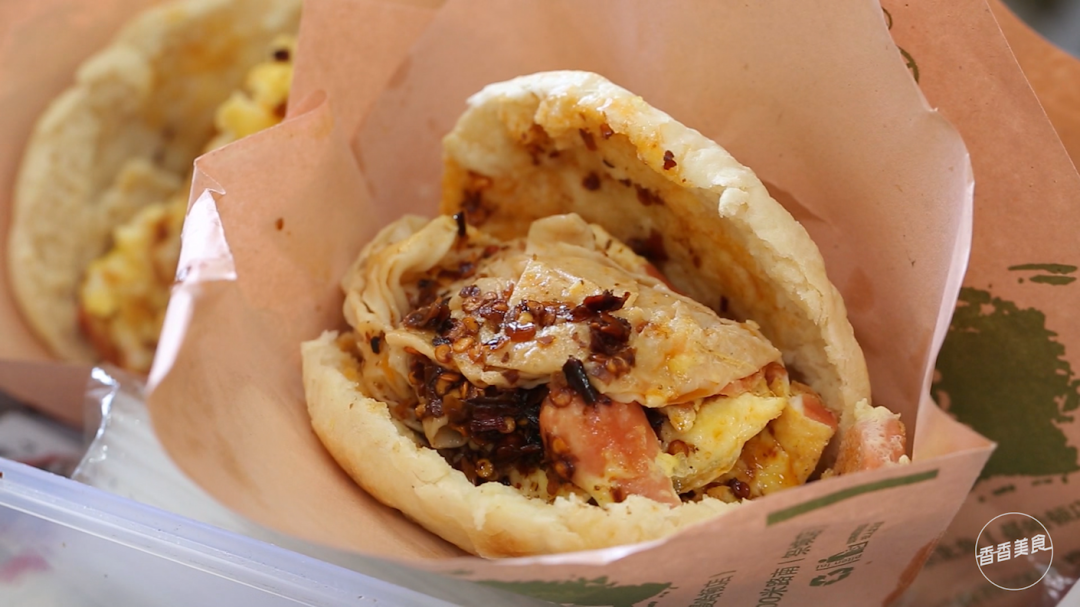 操作台上摆了几盆辣椒油,舀上两勺往饼里一倒,一个经典口味的灌汤烧饼就做好了。如果你口味比较重,还可以提前交代店员多放几勺辣椒。