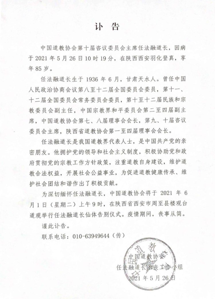 映象网讯 据中国道教协会网站消息,中国道教协会第十届咨议委员会主席任法融道长,因病于2021年5月26日10时19分,在陕西西安羽化登真,享年85岁。