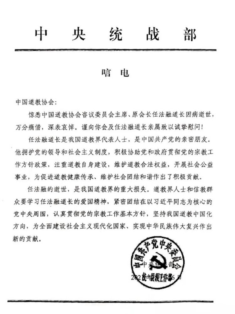 惊悉中国道教协会咨议委员会主席、原会长任法融道长因病逝世,万分痛惜,深表哀悼。谨向你会及任法融道长亲属致以诚挚慰问!