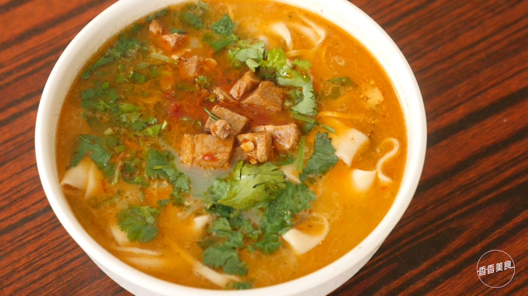 除了点睛之笔的羊油辣椒,这碗面做得也不含糊。烩面都是单锅单做,面条吃起来特别滑溜,薄中带着筋道的口感,很赞。羊汤也是自己熬的,不放辣椒的时候,鲜味比较突出。但放了辣椒之后又会变成另外一种感觉,整碗面的香味会特别浓郁。