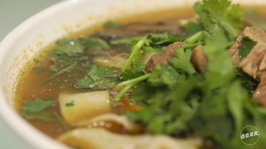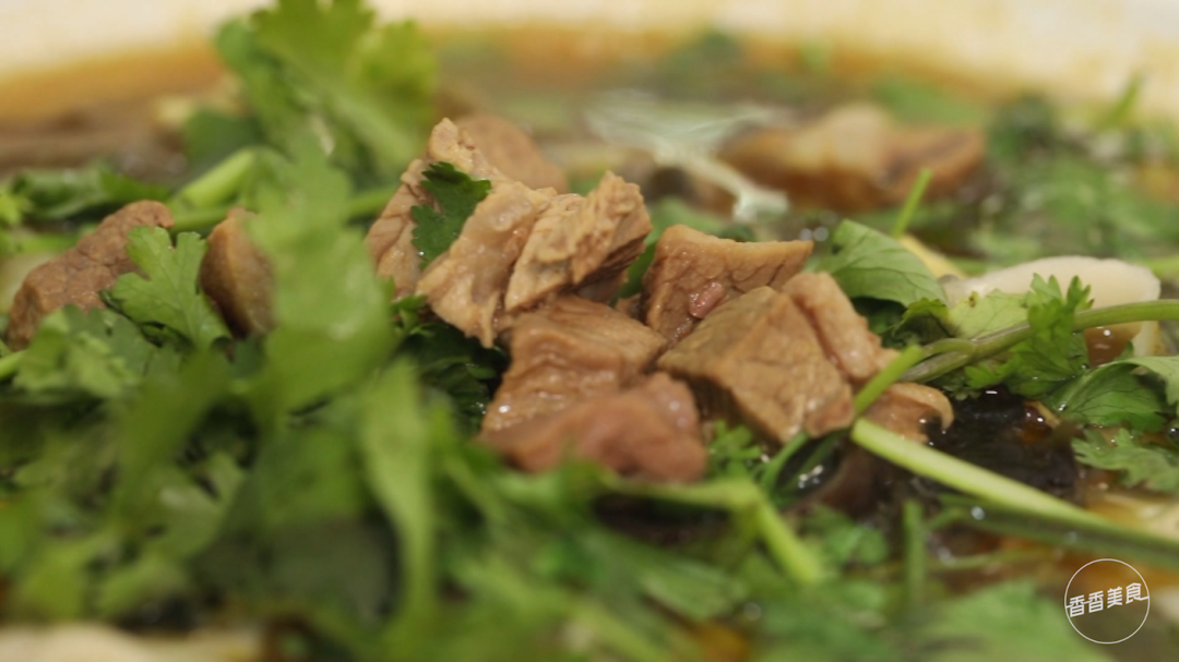 碗里放入料粉和料油,热汤浇下香菜撒上,再放入卤牛肉,这碗老烩面就可以上桌了。汤汁香浓滋味醇厚,面拉的很薄却很筋道。一碗烩面下肚,悠悠地打出一个饱嗝,整个人都舒坦了。