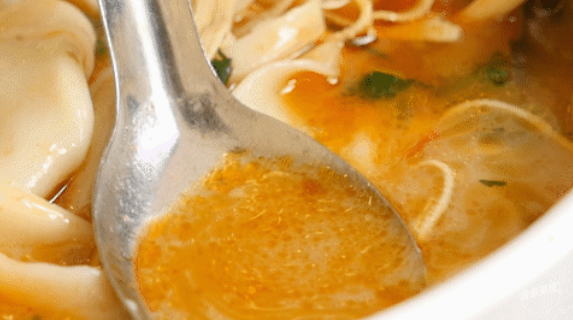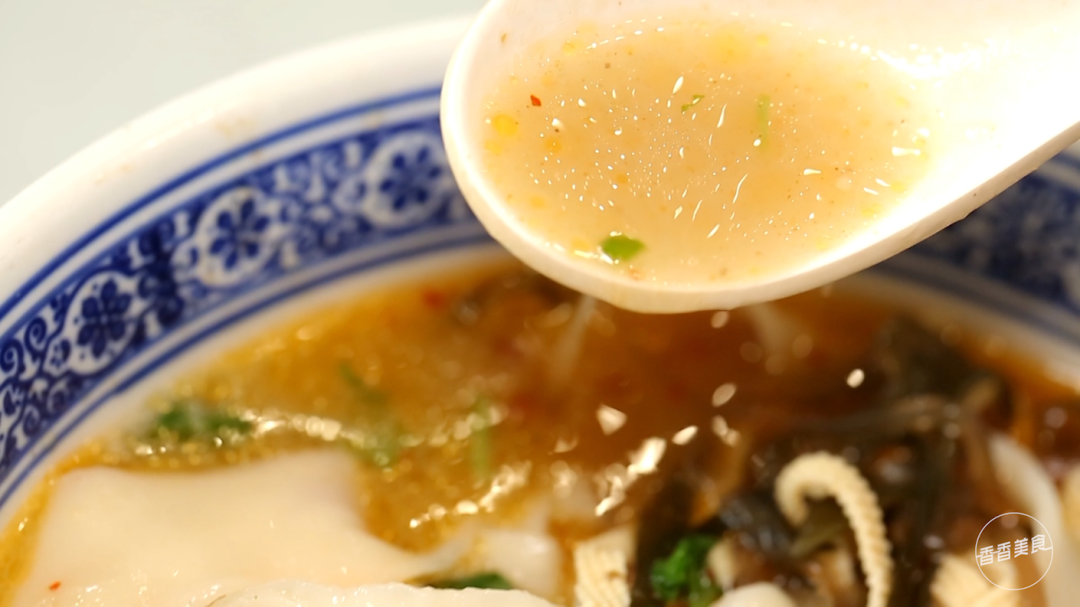 尝上一口汤,虽说有红油,喝起来却不辣。咽下去后,留在嘴里的只有浓郁的汤香。烩面宽厚有嚼劲,裹满了汤汁后很滑溜的吸入了嘴中。