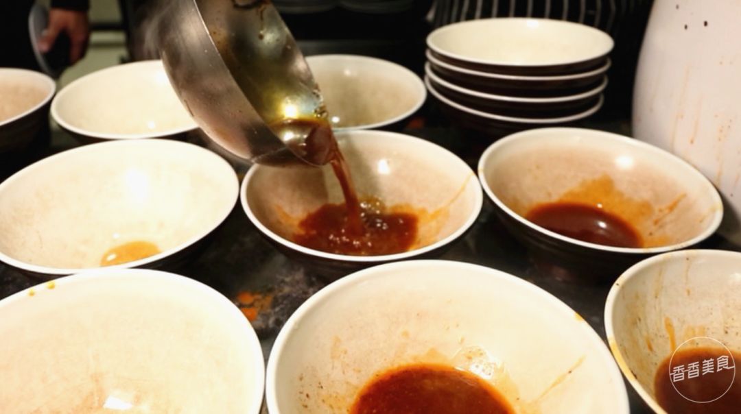烩面里的红汤,来自后厨的另一锅料。每碗面出锅前都要靠这一勺增香提味儿,再搭配牛骨清汤才能后味醇厚。听师傅讲,这是用专门从山西采购回来的辣椒做成的,别看红彤彤的,其实吃起来香而不辣。