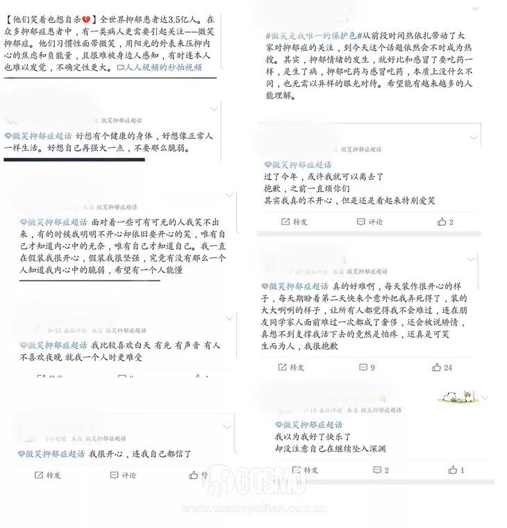 微博上#微笑是我唯一的保护色#话题有上百万的阅读量,“微笑抑郁症”的超话也像一个树洞,给在痛苦中隐忍的抑郁症患者一个输出口,倾诉迷茫与绝望。全球每40秒就有一人自杀身亡,每年有近80万人因为抑郁症失去生命。