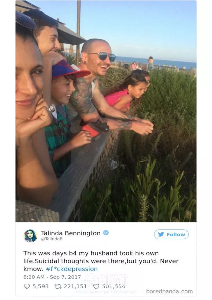 抑郁症没有所谓的模样,林肯乐队主唱Chester Bennington的妻子发布过一张合照,谁也不会想到照片上笑容灿烂的Chester Bennington会在这张照片拍下的几天之后自杀身亡。