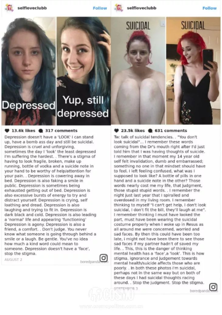 ins上一个叫#face of depression#(抑郁症的模样) 的话题引发了很大的反响。网友在ins上发布自己不笑和带有笑容的反差照片,也分享了自己的真实经历。想要打破偏见,改变人们对抑郁症患者的看法。