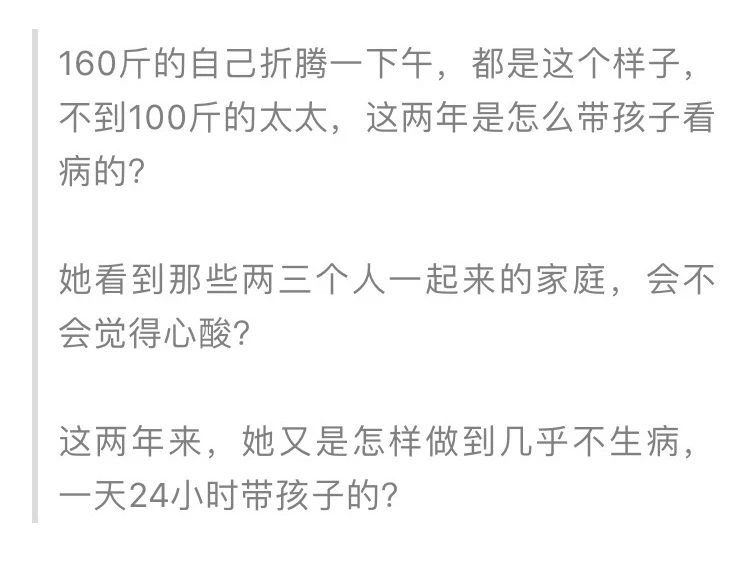 这次如果不是太太生病没办法带孩子去医院,我真无从知道带孩子去医院这么辛苦;也理解不了当初她是怎么挺着大肚子,楼上楼下各种检查,下午还赶着去公司处理工作的。