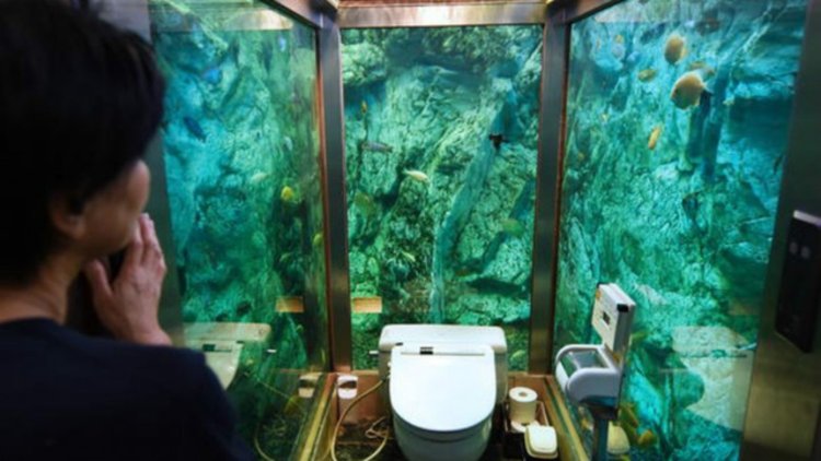 日本的水族馆卫生间,坐落在一个巨大的三壁水族馆,里面装满了鱼,海龟和美丽的珊瑚礁,让您在浴室里放松心情的时候又可能会紧张的看到几十双眼睛望着你。