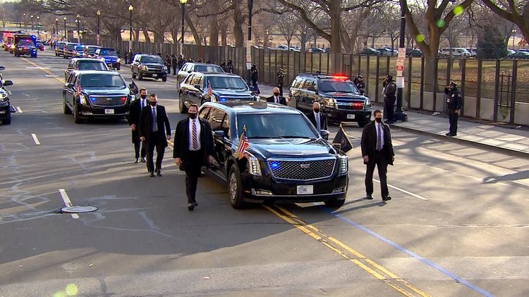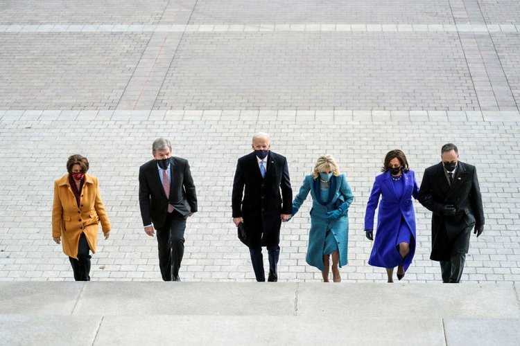 就职典礼结束后,在护卫队簇拥下,拜登与哈里斯一行通过宾夕法尼亚大街。下车后,拜登首次以总统身份,与第一夫人吉尔·拜登一起走进白宫,乐队演奏了《致首长的祝福》和《上帝保佑美国》。数分钟后,哈里斯首次以美国副总统身份步入白宫。