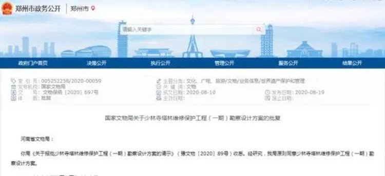 到少林必观塔林,但是经过日久风化的影响,塔林文物安全受到威胁。8月20日,郑州市人民政府网站公布《国家文物局关于少林寺塔林维修保护工程(一期)勘察设计方案的批复》,《批复》原则上同意少林寺塔林维修保护工程(一期)勘察设计方案。