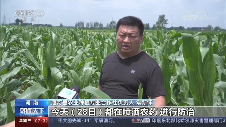 28号上午,在唐河县黑龙镇的玉米田里,当地农业技术专家正在指导农民开展草地贪夜蛾监测防治。今年,唐河县草地贪夜蛾发生面积70多亩,比去年同期面积大,时间早。
