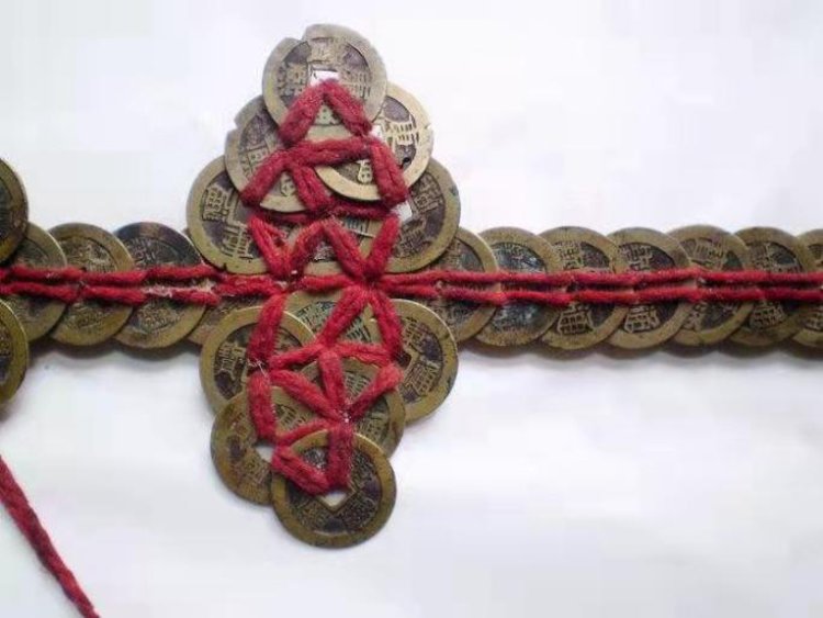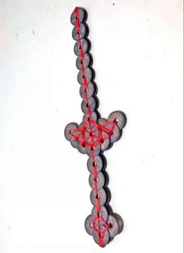 金钱剑用古铜钱手工穿制而成,古人视“铜”为吉物,认为可以化煞驱邪。铜钱外圆内方,外圆代表天,内方代表地,中间的黄帝号代表人,寓意“天地人”三才。旧时铜钱剑一般都是采用国力强大的年代的钱币,取“兴旺发达”之意。