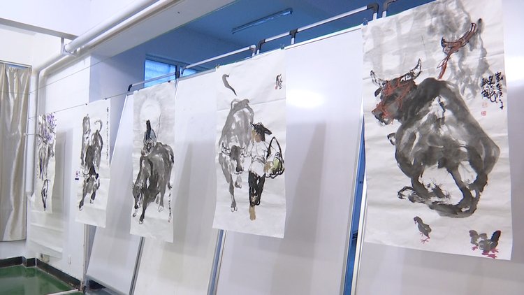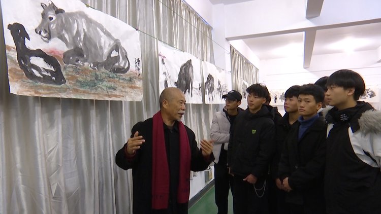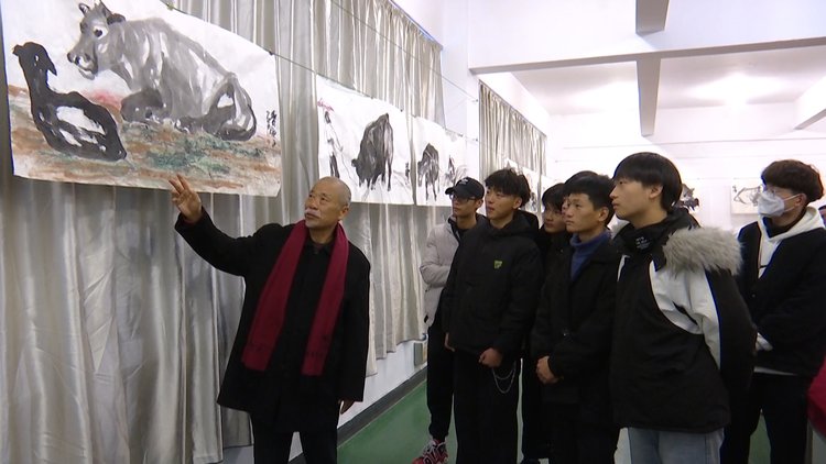 驻马店职业技术学院终身教授 李新国:这次的画展主要是反应一个是无声的歌,题目都是无声的歌。总共展出有30幅作品,反应了牛的生活,为什么我这次要画这个牛呢?我本身是个牡丹画家。我是这个学校的一个终身教授,我看到学校现在是学校的这个发展的,这个技术的发展非常快,我们学校的风气非常正,教师和领导啊,都像牛一样的慢慢的在耕耘,所以说,在猛然间里发出来的一个萌芽,想搞一幅牛的主题创作,把牛的各个姿态,牛这个不管是刮风下雨或者是烈日炎光,我都把他什么状态给他画出来,整个画展的一个名字都没题,就是叫我们老师对号入座,每个老师的提一个题材,你属于哪一种牛的类型,你会拿出你的微信,这对我们学校的发展是一个好事,这次展览不叫展览,叫学术研讨,主要是年纪大了六七十的人了,想带动这个年轻人,要把这个工作教育工作做好。把这个学校我们在学校里办好,我们学校争取明年的有一个新的台阶,你看这次这个学校的环境啊,包括学校的这个发展的气象啊。我总感觉我们都向着我们的这个年代一样,我们过去的都过去了,我们要奔向了牛年。画牛,牛年更牛,牛年牛气,牛年牛旺。总的就是这样初衷。这个画了以后啊,这个教师们的反响还是非常大,就是那种比较有生活啊这个话题比较。比较这个有感觉吧,有感觉他们有的看到有的落泪,有的老师感动落泪,他说这个牛我感觉太劳累了,我都像牛一样,我现在累得很,因为教师也比较累嘛,我就是这就是无声的歌,我都让你给这个我的画,一个新的形式出现,我们过去的画都是一个题目,我每一张都没有题目,就是对准就是给你一个读者,供读者共睹这句话你给我起名字,把这个艺术的传达给他,我最大的愿望就是把这个艺术走向这个每一个人的心灵之中,是艺术的在这个心灵中间里。开花结果,这是我最大的宗旨。