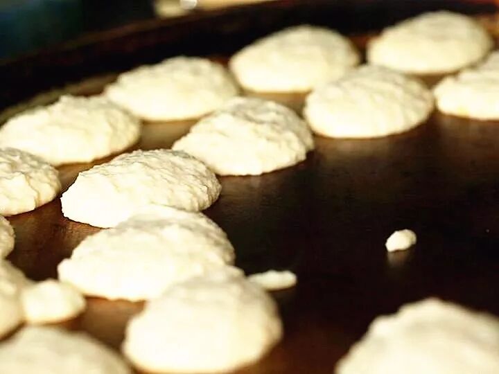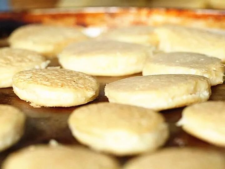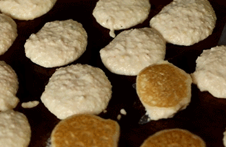 炕绿豆渣饼也是个技术活儿,除了每次的量要拿捏到位,炉子温度的把控也很重要。温度过高容易糊,温度过低做出来的渣饼口感发硬。待一面炕至焦黄翻起炕另一面,炕好的渣饼软软嫩嫩的,散发着一股清新的豆香味。