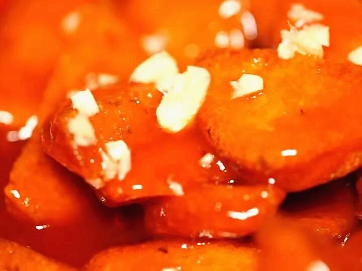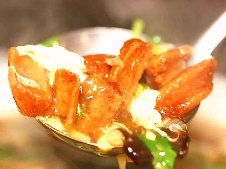 绿豆渣饼过油炸至表面金黄,炒糖做成拔丝渣饼。裹满了糖色的渣饼看起来很诱人,夹起时还有晶莹剔透的糖丝缠绕着筷头,入嘴外甜内糯,后味里透着淡淡的绿豆清香,别有一番滋味。
