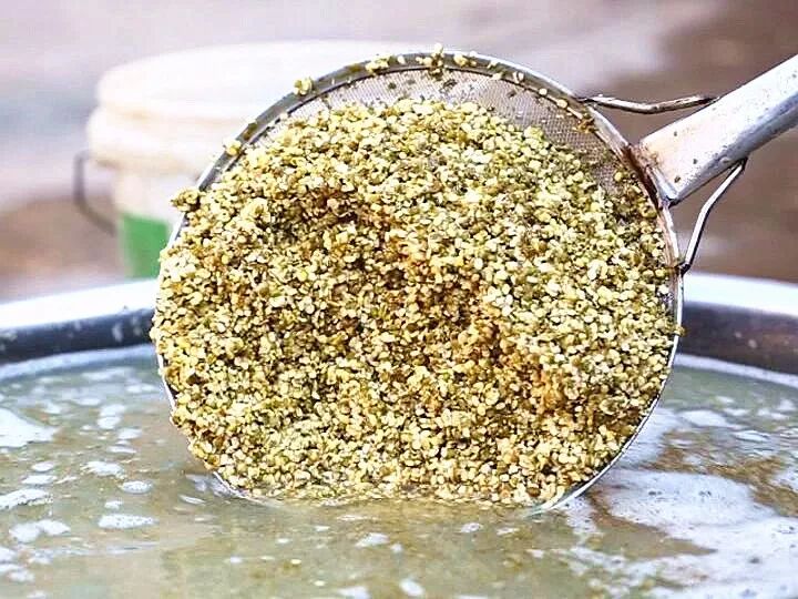 往经过揉搓的绿豆中加入水,薄薄的绿豆皮就打着旋儿漂了上来。用笊篱捞净绿豆皮,留下的就是黄灿灿的绿豆黄。接下来就可以磨浆做绿豆渣饼了。