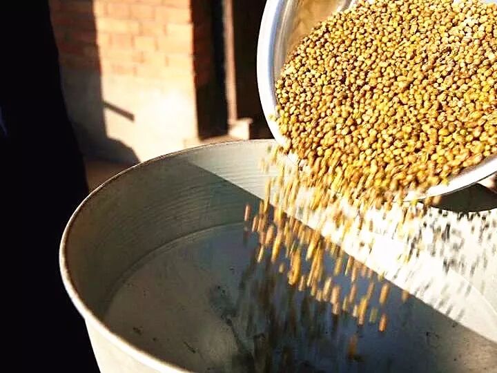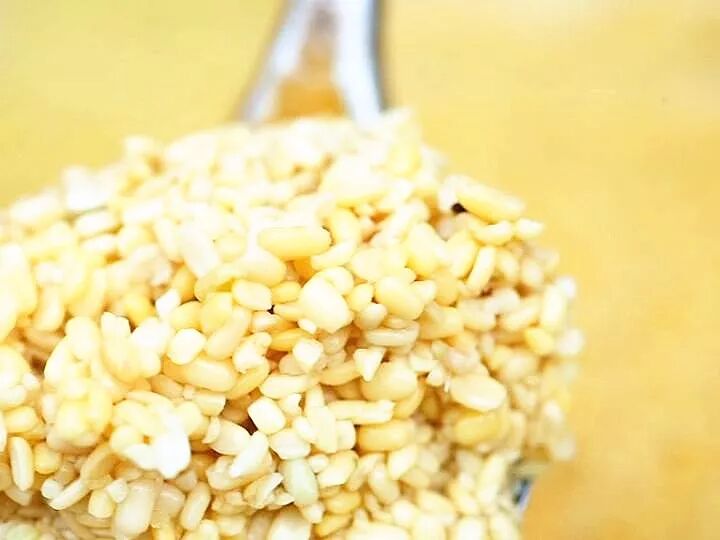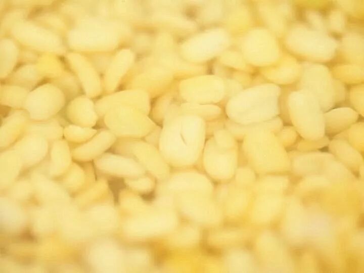 为了便于去皮磨浆,破开的绿豆还要在水里浸泡六七个小时才行。泡好的绿豆水分很足,轻轻一搓表皮就掉了。但要想每个绿豆皮都去除干净,可不是件容易的事儿。