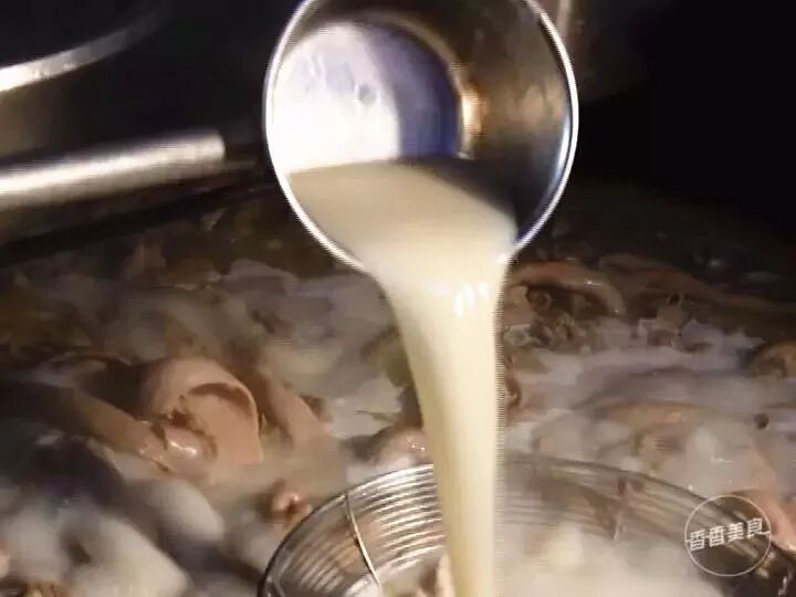 而要想熬出好汤,比例是关键。一锅汤大概需要一百多斤的羊大肠,羊小肠含油脂多,羊胎盘胶质丰富。大火咕咕嘟嘟煮上几个小时,待汤面上有一层薄薄的油脂时,汤就煮好了。