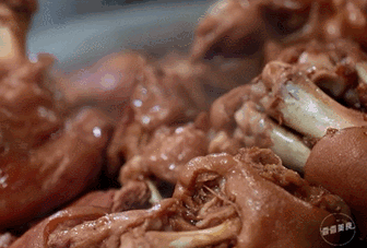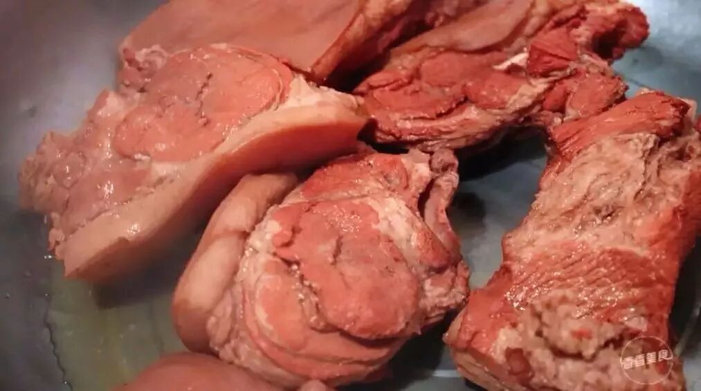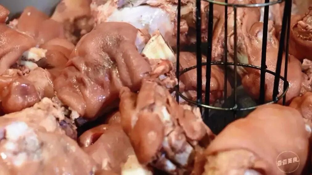 猪蹄膀清洗干净用火烧掉表面的毛发,和提前配好的大料一起放入水中卤煮。卤煮的过程中,火候的把控也很关键。要边煮边把血沫撇出去,据说这样才能更好的去除血腥味,待肉煮至八成熟时就可以捞出了。