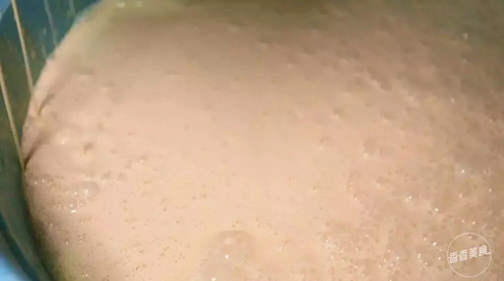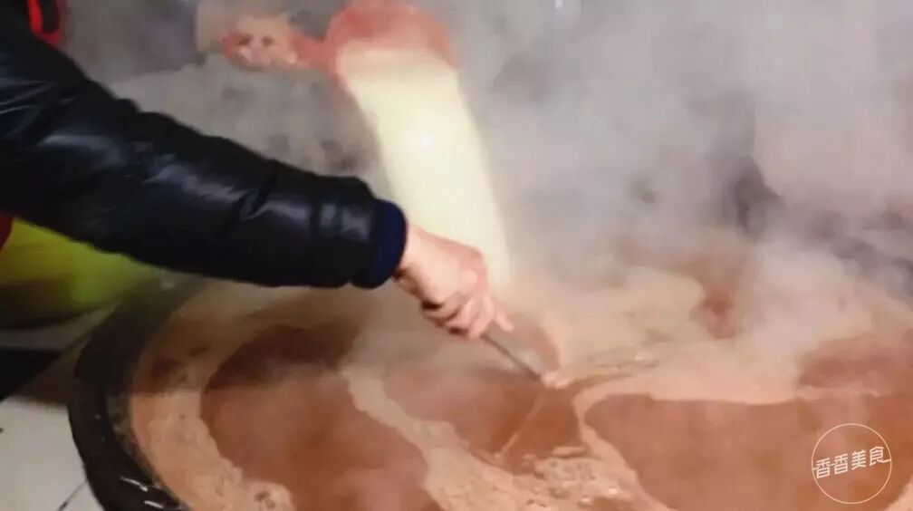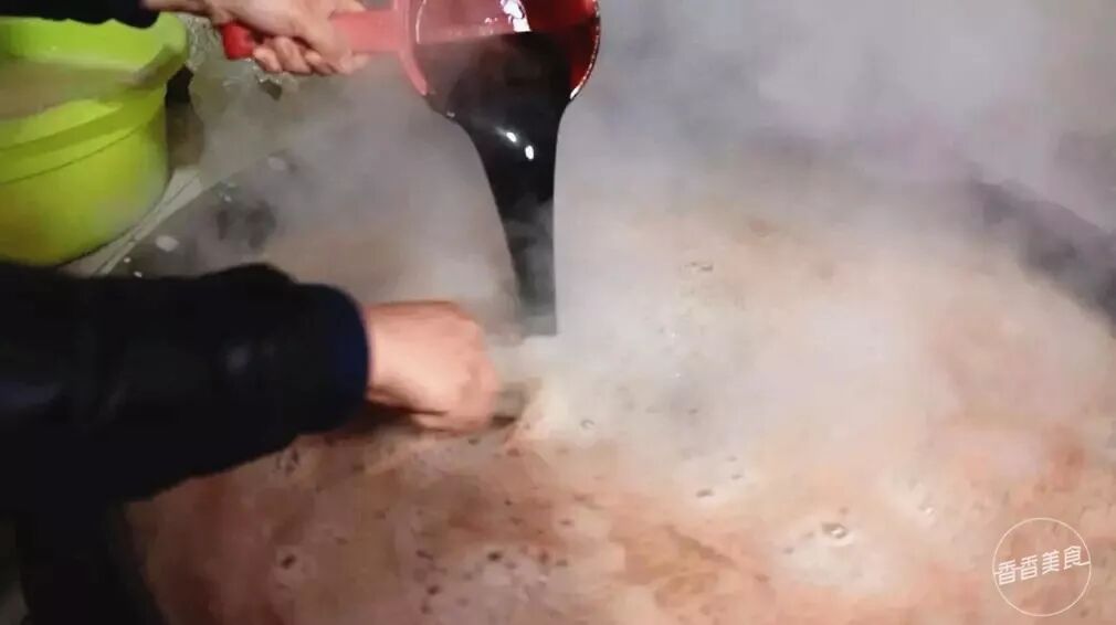 打好米浆后,就可以熬制了。用桂皮、良姜等大料熬好的料水作为底汤,烧开后加入配好的料粉调味,再倒入打好的米浆,最后加入用红糖、白糖熬好的糖色就可以了。