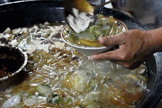 而要想做好一锅扁粉菜,还要在熬汤上下足功夫。听崔师傅说,最开始汤底都是肉汤,后来才逐渐变成用骨头熬汤。每天用猪大骨、猪蹄骨等熬制二十几个小时,待汤浓色白,味道浓郁鲜香时才可以。