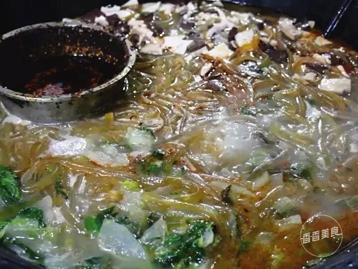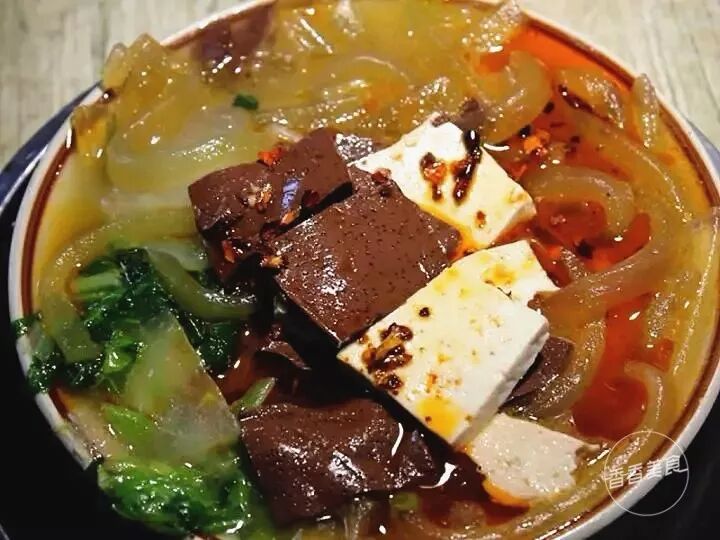 一碗扁粉菜里有豆腐、粉条、猪血等,挤挤挨挨的浸泡在油润的汤汁中。对于没吃过的吃货们而言,猛一瞅还以为是杂烩菜,其实不一样。吃上一口,粉条软滑筋道,豆腐软嫩,汤汁咸香浓郁,余味中透着微微的香辣,胃口顿时就被打开了。