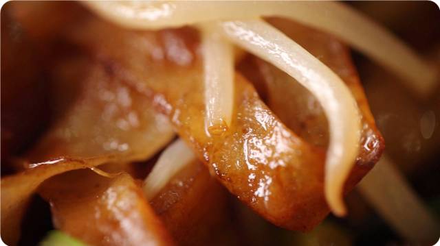 焖制的时候葱姜爆香,豆芽青菜打底,放入切好的饼丝,再加入吊汤、盖上锅盖。这时候把握焖制时间的秘诀就是“听锅”,听锅内的“刷刷”的水沸腾的声音。声音消失的瞬间,起盖出锅。再淋上炖好的坛子肉,饱满鲜艳的色泽还有油香肉香,无一不是吸引食客的制胜法宝。