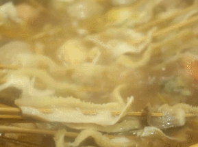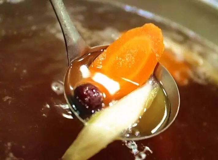涮牛肚的汤底呈现棕红色,看起来清淡闻着有淡淡的药香味。据说这是用21种中药材慢火煨成的,可以直接饮用有一定的滋补作用。而涮过牛肚的底汤就成了高汤,味道更加鲜美。