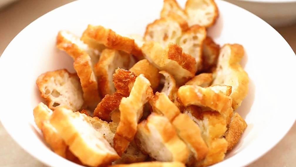 一进店,小编就被碗里金黄焦脆的麻烫给吸引住了,这不就是常吃的油条么?师傅说,麻烫和油条的外观很相似,口感却不太一样。油条口感蓬松香脆,比较适合干吃。而麻烫则硬实有嚼劲,长时间泡在汤里既能充分吸收汤汁,也不会变得软烂无味。