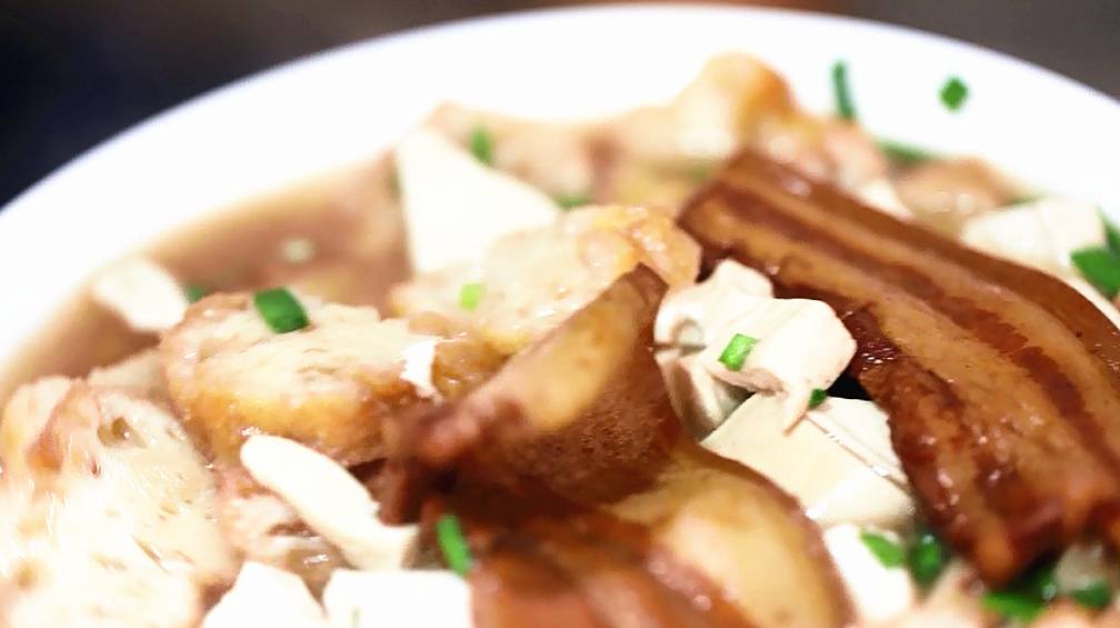 洁白的豆腐裹着汤汁浇在金黄焦脆的麻烫上,再放上一片提前卤好的肉,撒上一些韭菜碎就可以开吃了。翻动间肉香豆香和油香就窜了出来,赶紧喝上一口,汤汁鲜美豆腐软软嫩嫩如布丁,吸收了汤汁的麻烫柔软不失筋道,再咬上一口卤肉,那味道就更足了。