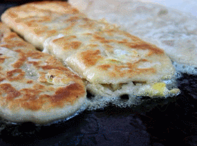 饼面的油沿着倾斜的锅缓缓流下