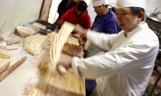 甩面师傅看起来没有多么强壮,甩面时发出的“砰砰砰”声却铿锵有力,扬起的面粉把发梢和眉毛都染白了。趁着忙碌的间隙,小编偷偷问他累不累,他笑着说,三四十岁正当年,这个年纪不好好干,到老了就干不动了。