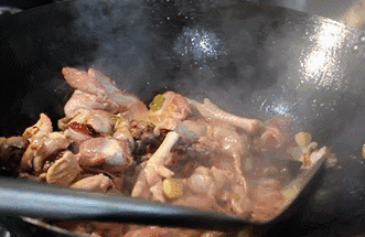 鸡肉切块儿清洗干净,不用提前腌制,也不用焯水,直接下锅炒。猛火翻炒爆香,待鸡肉体内的一部分水分被逼出后,就可以加入开水炖煮了。据说这样才能保证鸡肉在接下来的炖煮过程中,能够快速入味儿。