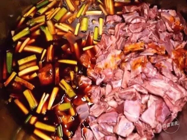 红焖羊肉色泽红润的秘密就在于特殊的豆瓣酱,据说这是在四川特别定制的。焖好的羊肉连汤倒入火锅中,上桌时还要继续加热保温。入口肥而不腻、醇香不膻,微微的辣味和酱香搭配的恰到好处。