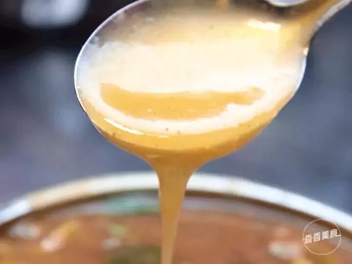和胡辣汤里有丰富的配菜不同,小焦鱼汤里的配菜只有手洗面筋。而要想汤底出味,就要靠料粉了。用肉蔻、草果、香砂等大料按照一定比例打成料粉加入汤中调味,浇入一勺熟油增香,出锅时再淋上一些炒好的糖色提味。