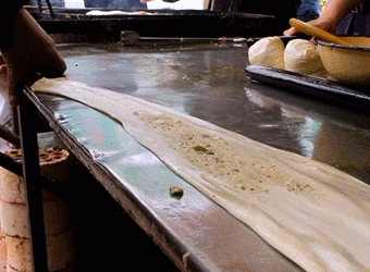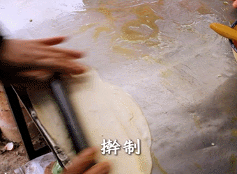 把面坯从原来的十厘米左右长度抻成一米五左右