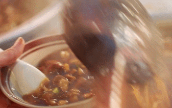先拿勺子顺着碗边儿划开一条缝,顺势抄底,把整块豆腐脑颠倒个个儿,让原本在上面的配料浸到碗底。三两分钟之后,这滋味儿就顺着豆腐脑的汁儿,扩散到碗里的每个角落。吃的时候,一定要大块大块吃,这也是碗蒸豆腐脑和那种一勺一勺舀出来的豆腐脑最大的区别。