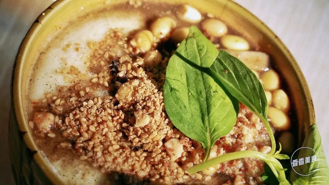 如果甜豆腐脑的搭配还在你意料之中,那和咸豆腐脑组cp的这几位,你一定猜不到。大块的香菇、煮熟的黄豆、切碎的花生,炒香的芝麻,还有这最最关键的一定要压轴出场的——荆芥,这完全就是捞面条的配置嘛。