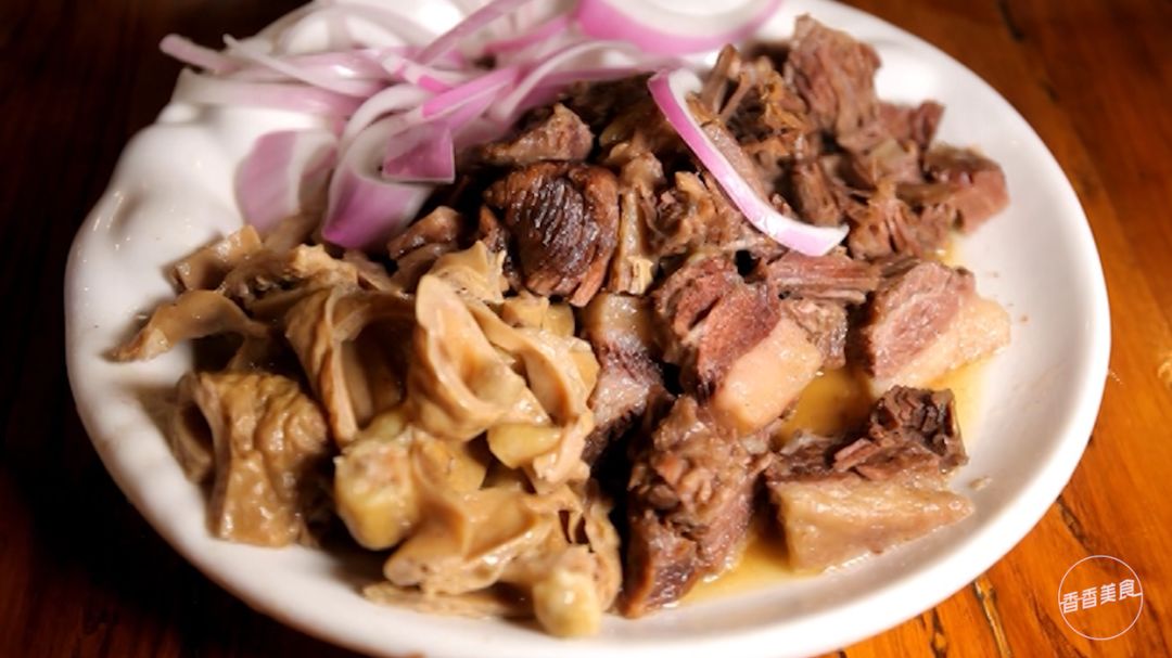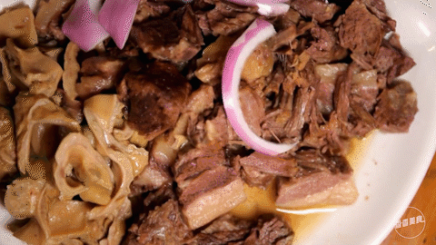 果不其然,卤汁儿顺着肉的纹理浸入驴的每个细胞,咀嚼间,肥瘦相间的搭配把口感的反差烘托到极致。肥肉筋、瘦肉烂,一口下去,肉香十足。刚想上头的时候,来一口泛甜的洋葱,食肉动物的优越感就被凸显出来了。