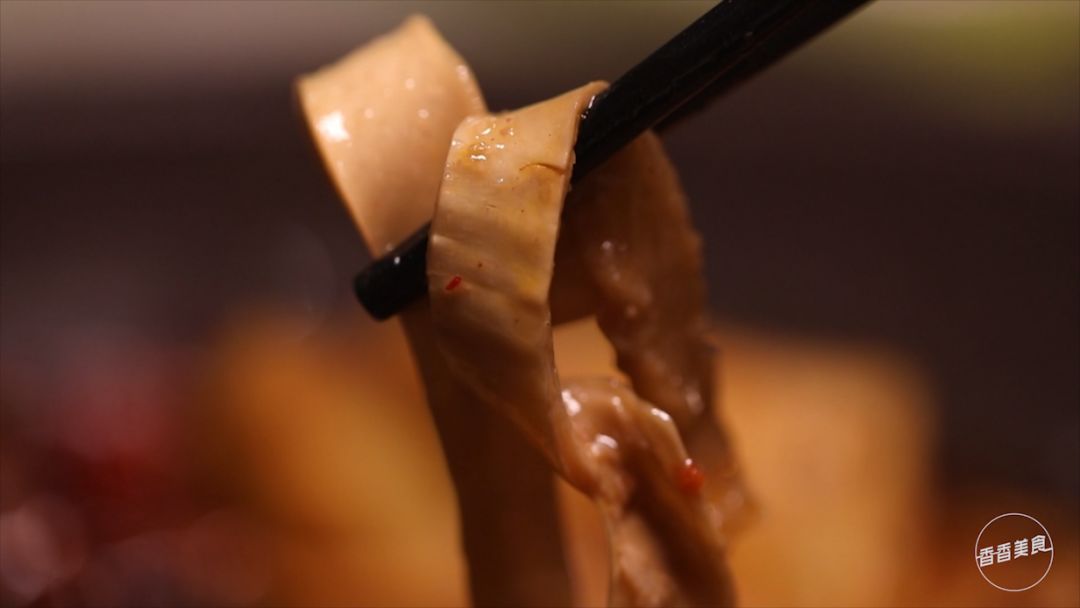 这里的板筋不仅好嚼,而且很有口感,柔软的质地下保留了三分的爽脆,再裹上一层红亮的辣汁儿,啧啧啧,不配上一口小酒都对不起这肉。当然要想把板筋做到这种地步,别的窍门没有,只能靠时间。据说这里的锅底在上桌前,必须要卤上6到8个小时才可以。