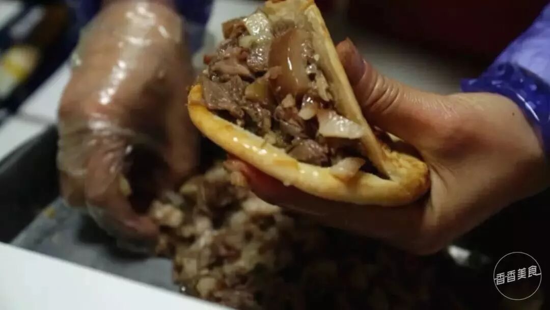 刚出炉的烧饼外皮酥脆焦黄,整整一面都是芝麻,经过高温烤制后散发着阵阵香气。羊肉剁得很碎,不用过多的调料,趁热夹在饼里。一口咬下去,软烂鲜香,顺势再喝上一口羊汤,那股独特的鲜美就顺着味蕾蔓延至了全身。