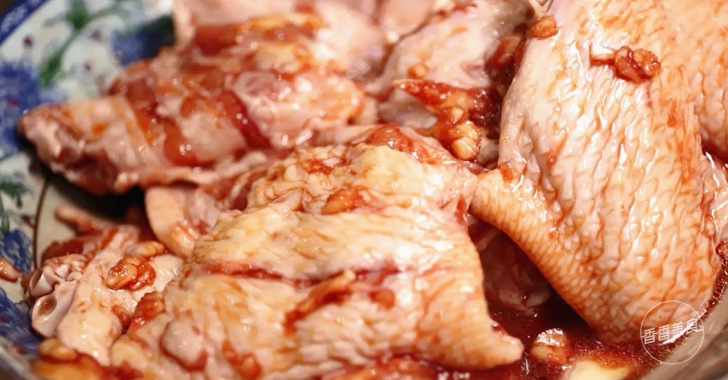 2.腌制:鸡翅背面改刀,划上三刀放到容器里,放入葱段、姜片,随后撒上少许盐、白糖、奥尔良烤鸡翅料粉和料酒,拌匀腌制入味儿;