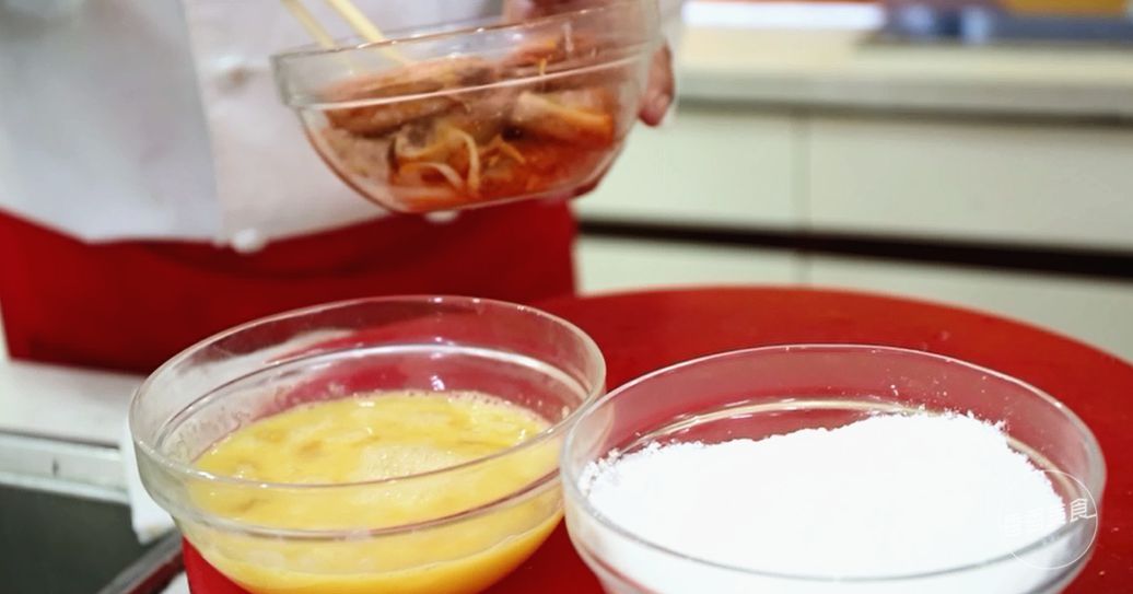 3.过三关;把腌制好的鸡翅,先裹上一层生粉,然后再蘸一些蛋液,最后再裹上一些捣碎的薯片,放在盘子里备用;