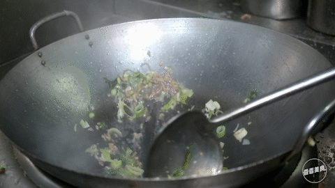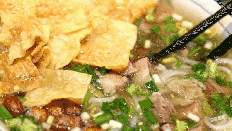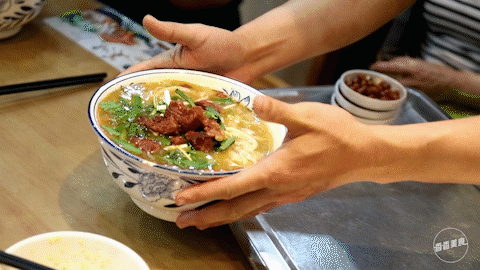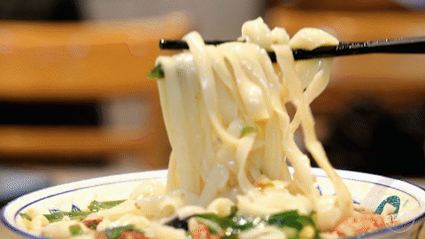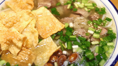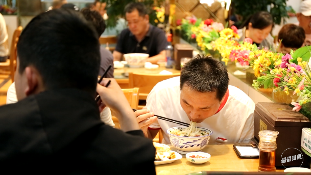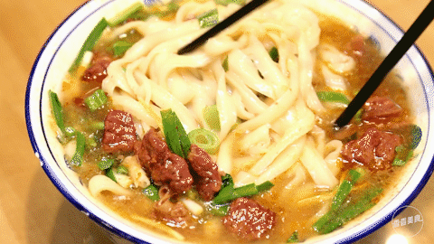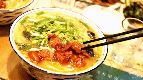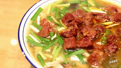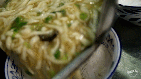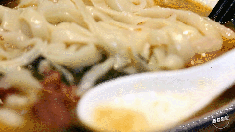 现在技术进步了,许多刀削面馆都改成机器人削面了,可这家还是最传统的人工削面。师傅手起刀落,一根根面条飞入锅中,很快就熟了。在做法上,这家刀削面又借鉴了南阳炝锅烩面。葱花姜末肉丝爆香,再添入高汤倒入面条煮一下。碗底提前放入了粉丝红枣枸杞,热汤一浇香味就出来了。