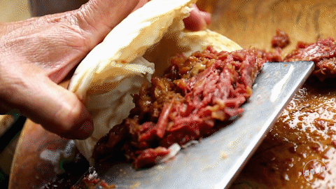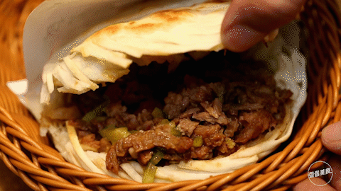 我们观察了一下,吃米线的话,大多数人都会配一个肉夹馍。酱牛肉配上青椒剁碎,塞进热饼里,一口下去酥的掉渣,饼香肉嫩青椒脆,这感觉带劲!
