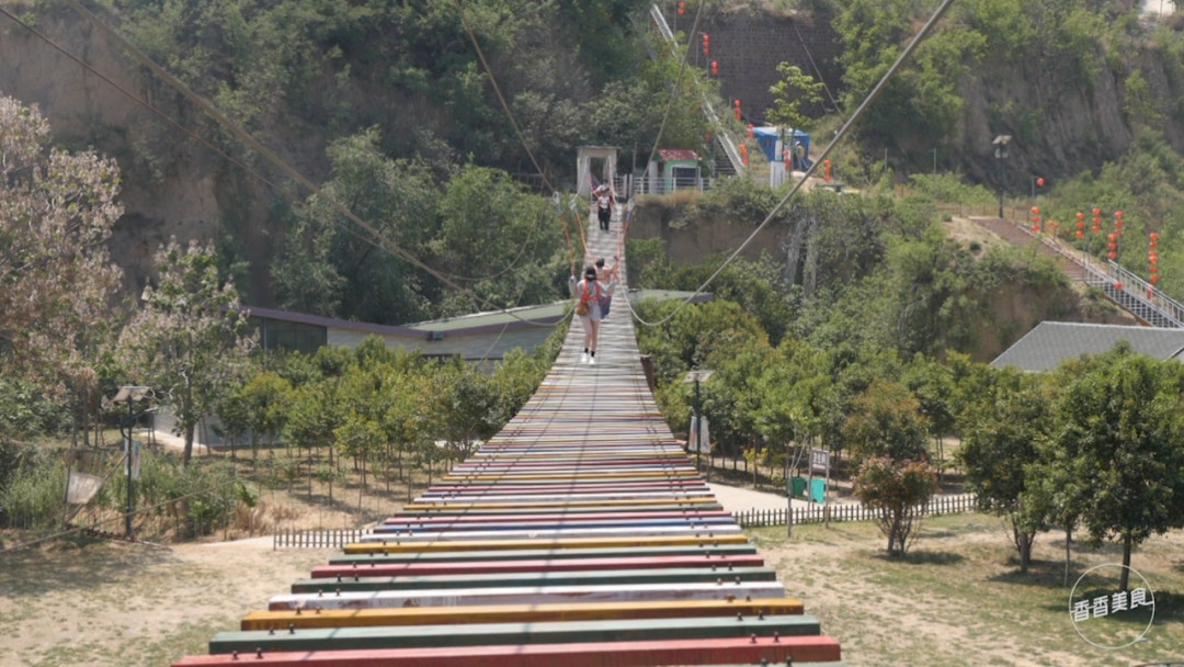 网红桥晃晃悠悠,很考验团队协作力。 各种游乐设施的收费,均在10到30元之间,价格不算贵。 景区附近有四五十家农家乐,里面还有儿童乐园,小朋友们有撒欢儿的地方啦。 眼睛尽情享受了美景的按摩,肚子也需要美食的抚慰。临近中午,农家乐餐厅里已经满座。坐在藤萝架下,吹着微风,听着流水声,品一桌农家菜再惬意不过!游客们纷纷推荐了炖柴鸡,说地锅炖出来的才有味道。 鸡汤表面浮着一层黄黄的鸡油,香气浓郁看着也很诱人。鸡皮弹弹的,鸡肉紧致筋道,吃起来也不柴。88元的价钱,不算太贵。 和地锅柴鸡搭配的是一碟焦香的炸馍片。直接吃香脆可口,鸡汤里泡上20秒捞出,边缘已经被鸡汤泡软,芯还是脆脆的,别有一番风味。 贴心提醒:景区内有三个停车场总共一百多个车位,还是比较充足的。如果想住一晚的话,农家乐里也有田园客栈。